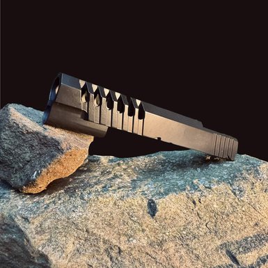 A close-up of a Glock pistol slide with a sleek Cerakote finish, showcasing precision coating for firearm customization.
